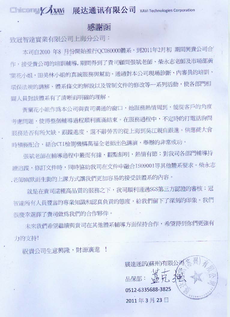 展达通讯感谢函