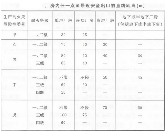 4、厂房内任一点至最近安全出口的直线距离不应大于下表的规定。