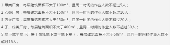 2、厂房内每个防火分区或一个防火分区内的每个楼层,其安全出口的数量应经计算确定,且不应少于2个;当符合下列条件时,可设置1个安全出口: