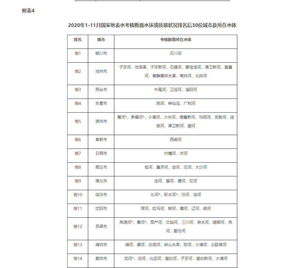 参加排名的全国地级及以上城市,覆盖2050个国控断面(其中1940个为国家地表水考核断面,110个为入海控制断面)。2020年11月,全国地级及以上城市中,林芝、乌鲁木齐、永州市等30个城市国家地表水考核断面水环境质量相对较好(从第1名至第30名),开封、沧州、聊城市等30个城市国家地表水考核断面水环境质量相对较差(从倒数第1名至倒数第30名)。2020年1-11月,全国地级及以上城市中,柳州、张掖、金昌市等30个城市国家地表水考核断面水环境质量相对较好(从第1名至第30名),铜川、沧州、邢台市等30个城市国家地表水考核断面水环境质量相对较差(从倒数第1名至倒数第30名)。详细见附表1~附表4。