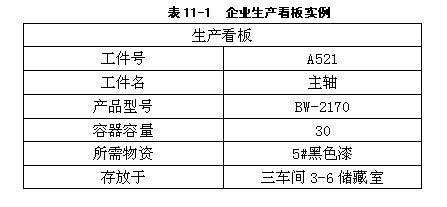 生产看板是在工厂内指示某工序加工制造规定数量工件所用的看板,内容包括:需要加工工件的件号、件名、类型、工件存放位工件背面编号、加工设备等,如表1