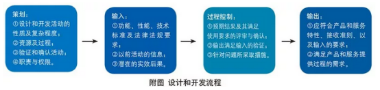 组织应建立、实施和保持设计和开发的策划、输入、过程控制、输出以及更改的过程,确保后续的产品和服务的提供。在设计和开发的各个控制阶段,主要考虑设计和开发活动的性质、产品和服务的具体类型、输出满足输入的要求、提供产品和服务过程的需求,设计和开发流程见附图。