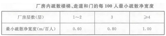 5、厂房内疏散楼梯、走道、门的各自总净宽度,应根据疏散人数按每100人的最小疏散净宽度不小于下表的规定计算确定。但疏散楼梯的最小净宽度不宜小于1.10m,疏散走道的最小净宽度不宜小于1.40m,门的最小净宽度不宜小于0.90m。当每层疏散人数不相等时,疏散楼梯的总净宽度应分层计算,下层楼梯总净宽度应按该层及以上疏散人数最多一层的疏散人数计算。