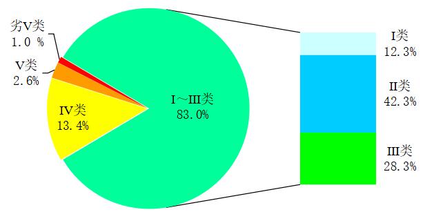 2020年11月,1940个国家地表水考核断面中,水质优良(Ⅰ~Ⅲ类)断面比例为83.0%,同比上升4.0个百分点;劣Ⅴ类断面比例为1.0%,同比下降2.1个百分点。主要污染指标为化学需氧量、总磷和高锰酸盐指数。