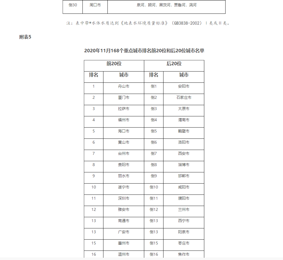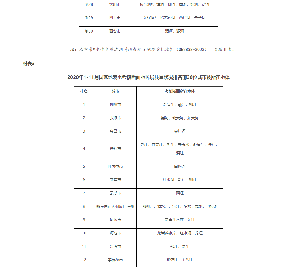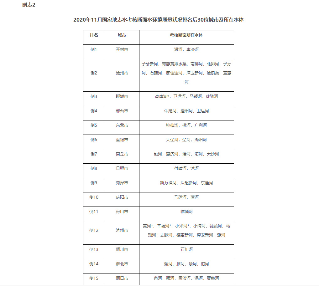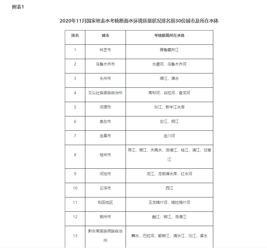 参加排名的全国地级及以上城市,覆盖2050个国控断面(其中1940个为国家地表水考核断面,110个为入海控制断面)。2020年11月,全国地级及以上城市中,林芝、乌鲁木齐、永州市等30个城市国家地表水考核断面水环境质量相对较好(从第1名至第30名),开封、沧州、聊城市等30个城市国家地表水考核断面水环境质量相对较差(从倒数第1名至倒数第30名)。2020年1-11月,全国地级及以上城市中,柳州、张掖、金昌市等30个城市国家地表水考核断面水环境质量相对较好(从第1名至第30名),铜川、沧州、邢台市等30个城市国家地表水考核断面水环境质量相对较差(从倒数第1名至倒数第30名)。详细见附表1~附表4。