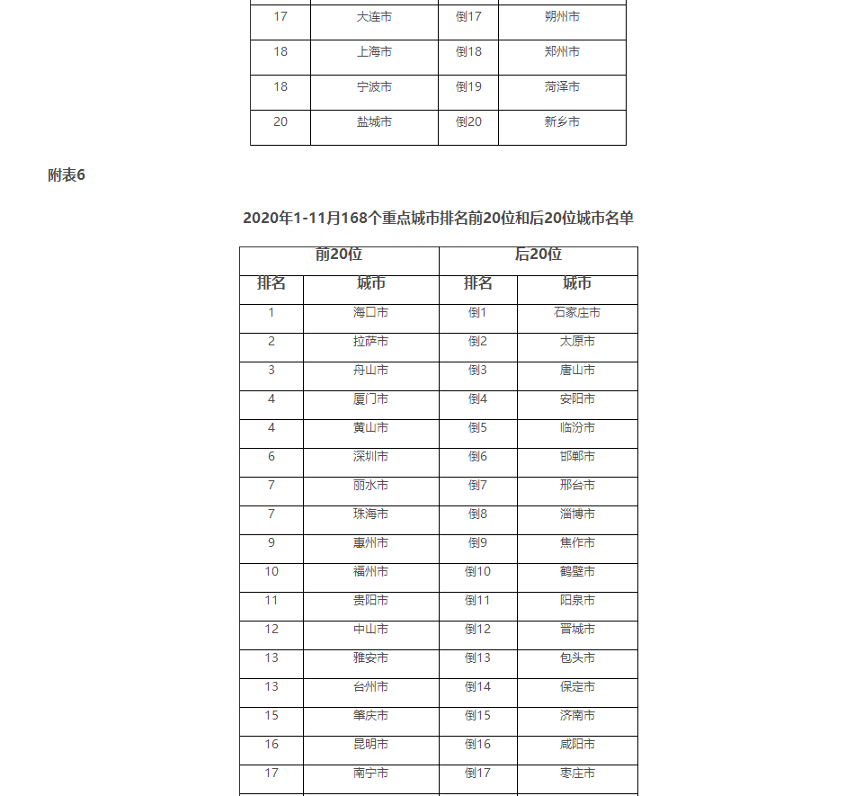 1-11月,168个重点城市中,石家庄、太原和唐山市等城市空气质量相对较差(从倒数第1名至并列倒数第20名);海口、拉萨和舟山市等城市空气质量相对较好(从第1名至并列第19名),见附表6。