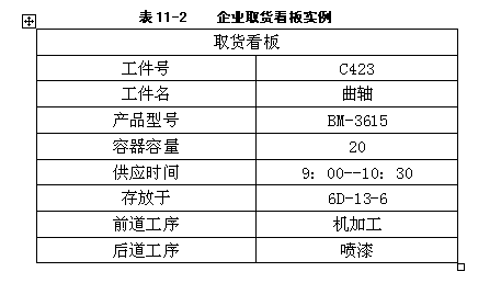 生产看板是在工厂内指示某工序加工制造规定数量工件所用的看板,内容包括:需要加工工件的件号、件名、类型、工件存放位工件背面编号、加工设备等,如表1